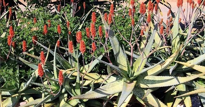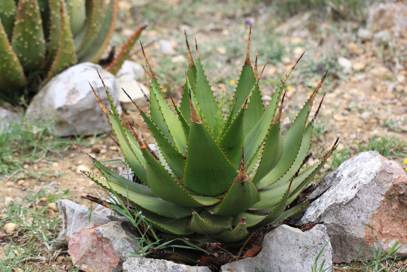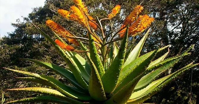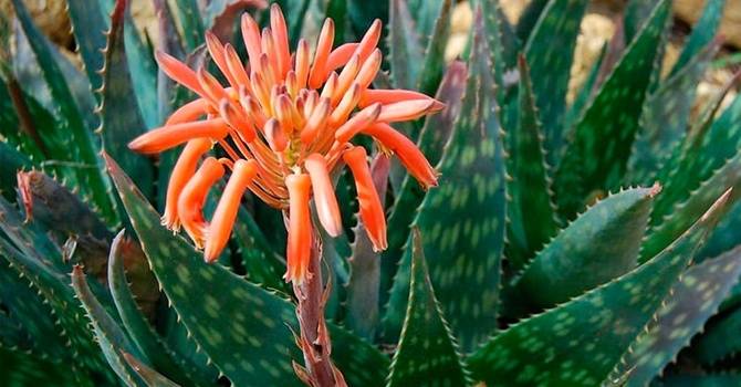 алоэ остистое – распространилось из ЮАР, выращивается как декоративное, поскольку имеет плотную розетку мясистых, в белую крапинку листьев и длинный цветонос посередине, с оранжевыми или красноватыми цветками;