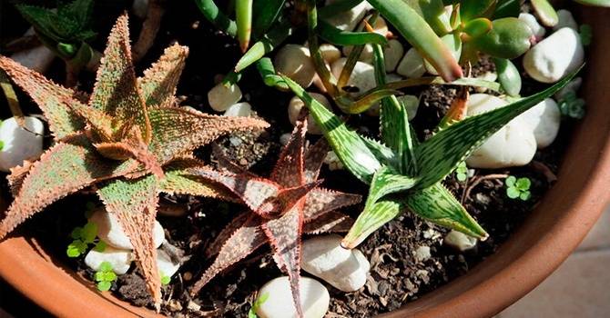 алоэ микс – это “ассорти” из разных видов, подходящих для совместного культивирования, сходных по характеристикам и хорошо сочетающихся в общей композиции, например таких, как остистое, тигровое, пестрое и Марлота.