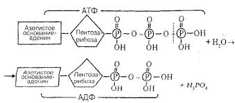 Молекула АТФ образована азотистым основанием, пятиуглеродным сахаром рибозой и тремя остатками фосфорной кислоты. Фосфатные группы в молекуле АТФ между собой соединены высокоэнергетическими (макроэргическими) связями.