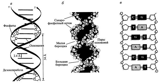 Двойная спираль стабилизируется многочисленными водородными связями (две образуются между А и Т, три – между Г и Ц) и гидрофобными взаимодействиями.