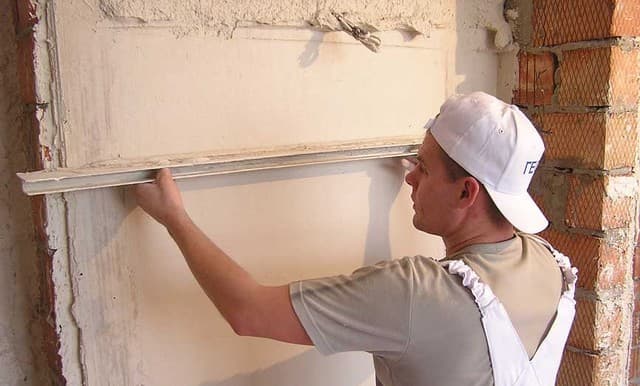 После нанесения раствора на стену его растягивают и выравнивают. Для этого берут кельму, мастерок (при небольшом объеме работ) или правило – облегченная рейка, изготовленная из алюминиевая с трапециевидным профилем. Длина последнего инструмента может достигать трех метров, но тогда им пользуются вдвоем. Обычно правило бывает не длиннее двух метров. Инструментом разравнивают и срезают смесь.
