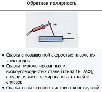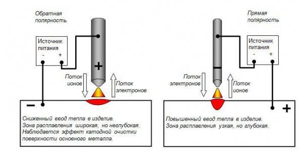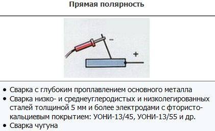 Прямой вариант используют, когда предстоит сварка чугунных изделий или требуется глубокий проплав металла. Обратный вариант применяется, когда требуется сварить нетолстые листы, а сварка происходит с усиленной скоростью расплавки электрода, и еще для сваривания низкоуглеродистой стали.