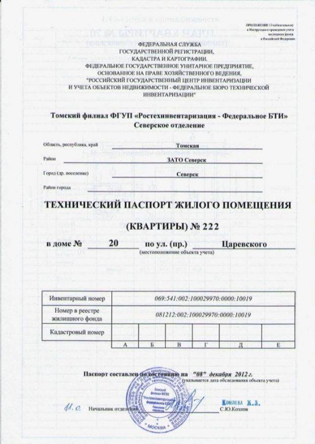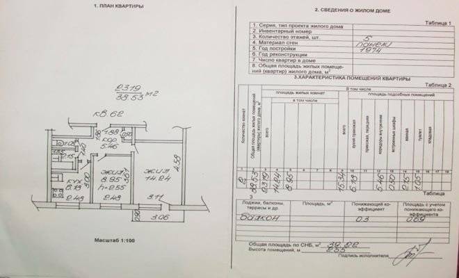 В описательной части присутствует информация об адресе квартиры, владельце и инвентаризационной стоимости. Также прилагаются планы, расчеты, а венчает пакет подпись проводившего измерения лица, с расшифровкой фамилии, указанием должности, места работы. Данные заверяются штампом организации или печатью.