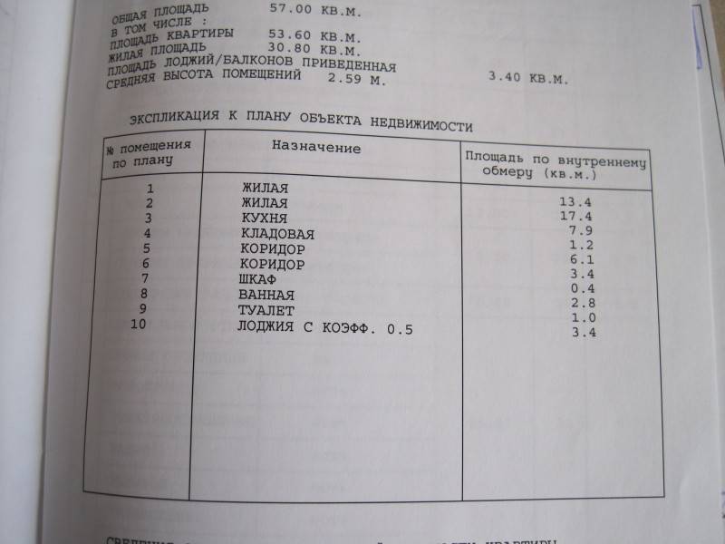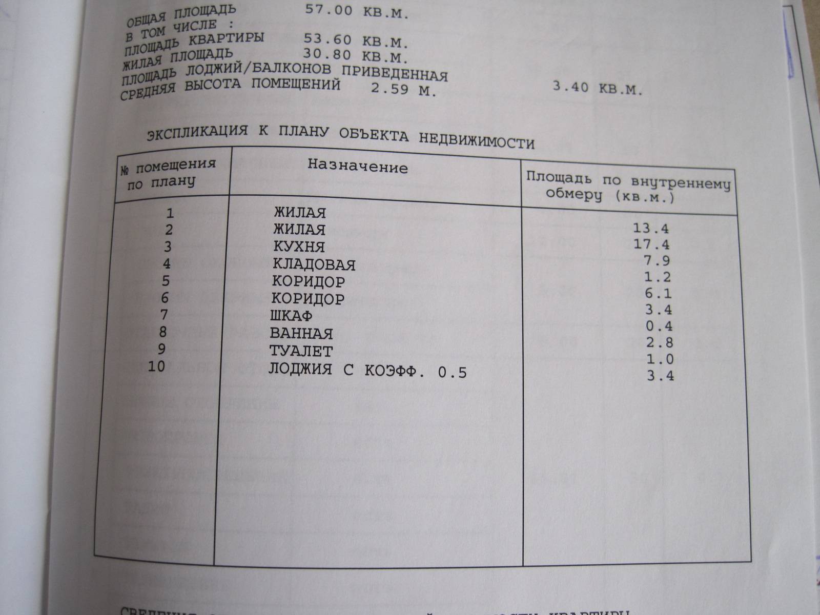Страница из Технического паспорта. Площадь квартиры с расшифровкой по комнатам
