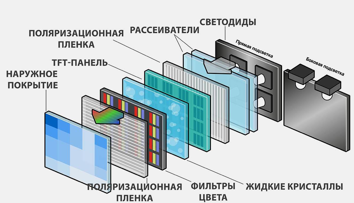 Собственно, эти слои нужны в том числе для того, чтобы вместить подсветку: для минимизации объема ее принято размещать по бокам. В более простых вариантах LСD-экран светится весь: по сути, экран превращается в одну большую лампу, которая светит пользователю прямо в глаза.