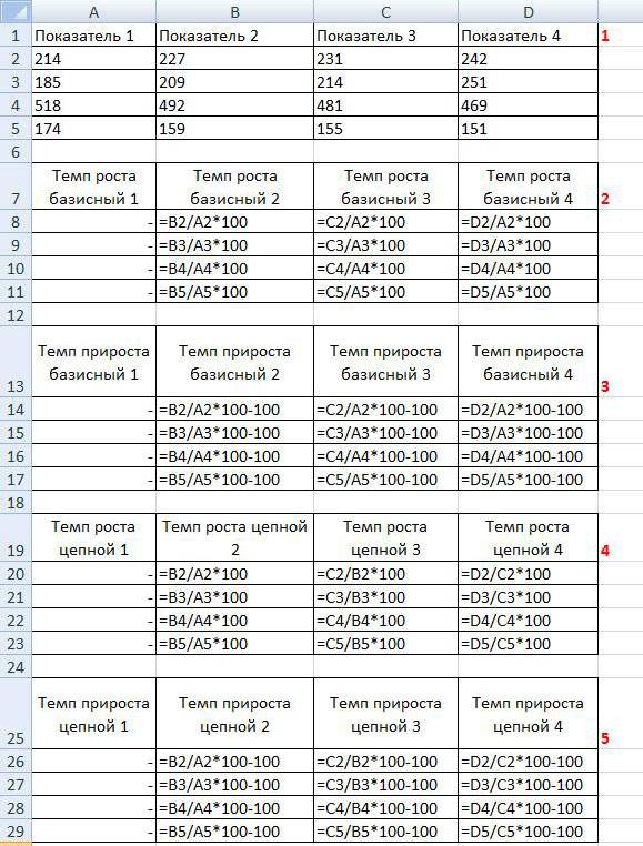 В расчет цепного темпа роста (ЦТР) используются все показатели, кроме первого. Способ вычисления отличается тем, что Показатель 2 делится на П1, умножается на 100. Затем П3 делят на П2 и умножают на 100. База вычисления — основной показатель. П4 делят на П3 и умножают на 100, при расчете ЦТП из каждого показателя ЦТР вычитают 100.