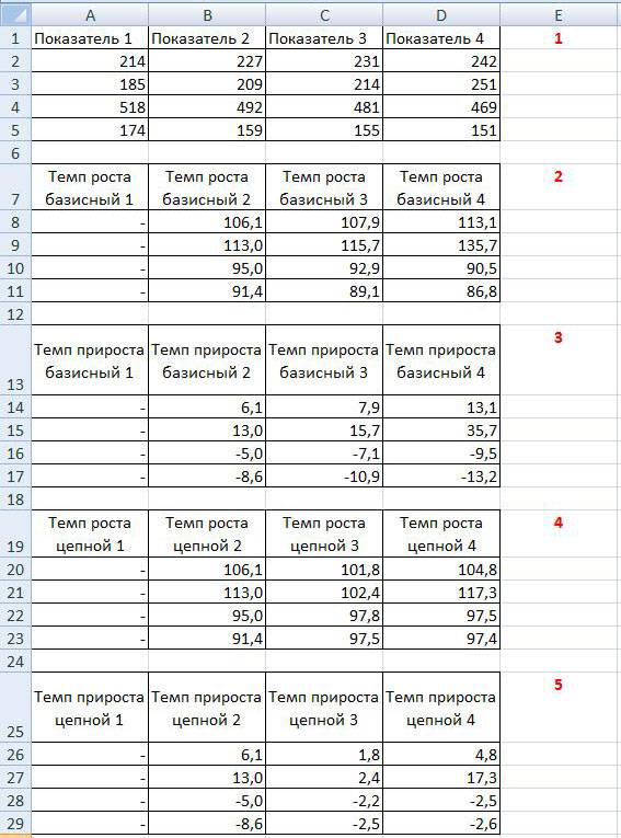 В примере за базисный показатель принят Показатель 1, поэтому базисный темп роста или базисный темп прироста рассчитывается исходя из этого положения, то есть при расчете базисного темпа роста Показатель 2 делим на Показатель 1 и умножаем на 100, далее Показатель 3 делим на Показатель 1 и умножаем на 100, далее Показатель 3 делим на Показатель 1 и умножаем на 100, при расчете базисного темпа прироста из каждого показателя базисного темпа роста вычитаем 100.
