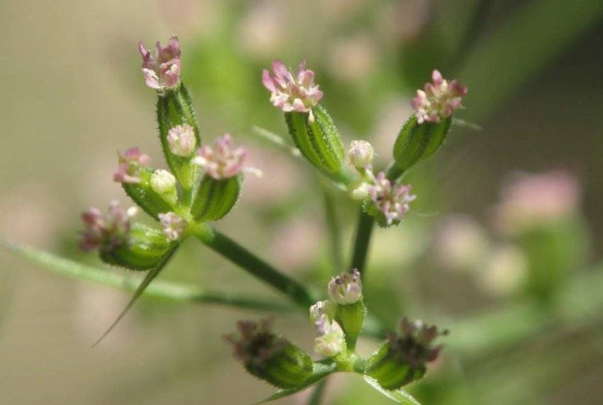 Стебель прямостоячий и ветвистый в нижней части. Высотой он 0,2–0,6 м, а если будет получать достаточно влаги, может вырасти до 1,2 м. Зацветает растение мелкими белыми или красными цветами до 2,5 см в диаметре, собранными в двойные зонтики. Цветение припадает на июнь-июль. Пряность популярна в восточной кухне.