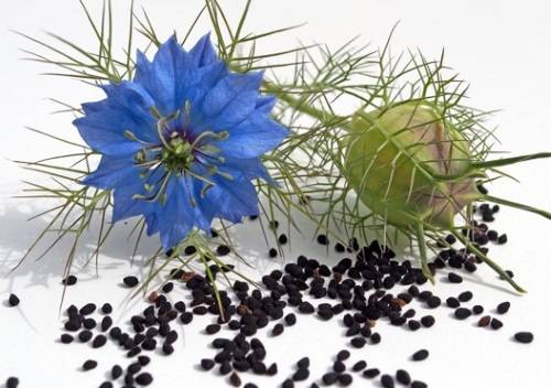 Непохож на тмин коричневый, ни внешне, ни по вкусу. Его называют еще чернушкой или калинджи. Вырастает до 30см. Листья мелкие тонкие. Цветки бледно-голубые, напоминают звездочки. Черные мелкие семена собраны в круглые коробочки.