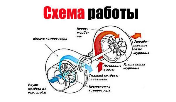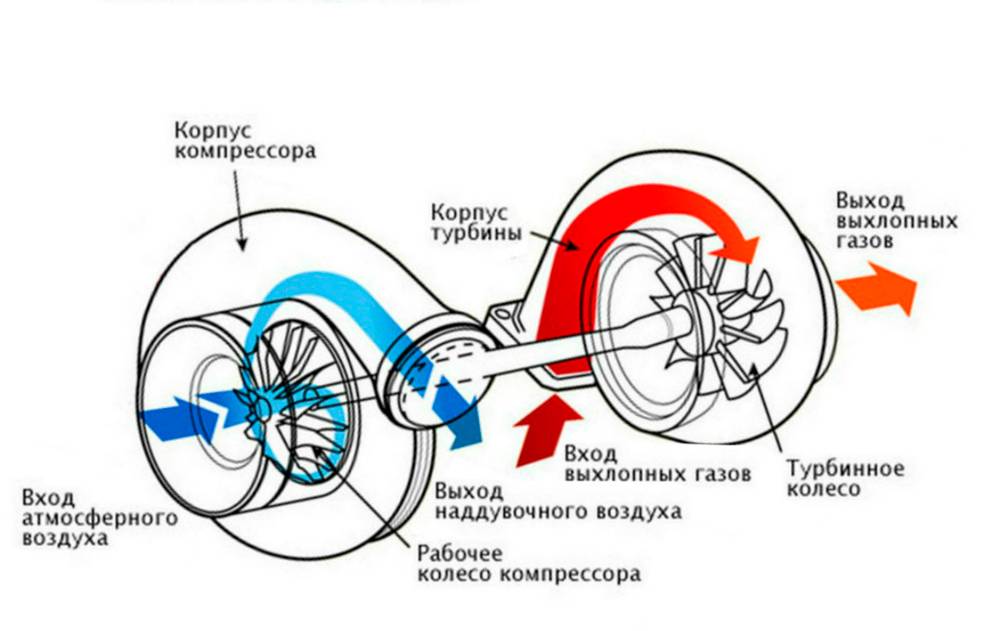 Принцип ее работы также прост, при работе двигателя, на такте выпуска, выходят отработанные газы в глушитель, по специальному каналу они идут и раскручивают горячее колесо турбины, которое сидит на одном валу с холодным, соответственно и холодное колесо начинает бешено крутиться.