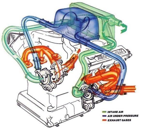 Система Twin-Turbo может работать и устанавливаться на двигателях V-образного типа, также подойдут и рядные моторы, особого отличия в этом факте нет. Основной целью работы подобной установки-увеличение производительности автомобиля и быстрый набор скорости.