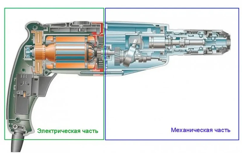 Отличие перфоратора от дрели состоит в том, что у перфоратора ударный механизм, который представляет собой сложный узел, работа которого возможна в электромеханическом и электропневматическом исполнении. Зачастую выпускается электропневматический вид перфоратора, так как пневматика позволяет улучшать параметры эксплуатации инструмента.