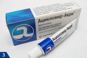 Ацикловир предотвращает передачу вируса здоровым клеткам. Он применяется для лечения и купирования симптомов герпеса, ветряной оспы и опоясывающего лишая. Выпускается в различных формах, чаще всего назначается в виде мази, крема (инструкция) и таблеток (инструкция). Мазь, применяемая непосредственно на пораженный участок уменьшает боль, зуд, ограничивает распространение и ускоряет заживление. Врач может назначить его в виде таблеток 10-тидневным курсом или длительными курсами от полугода при частых рецидивах (6 и более раз в год).