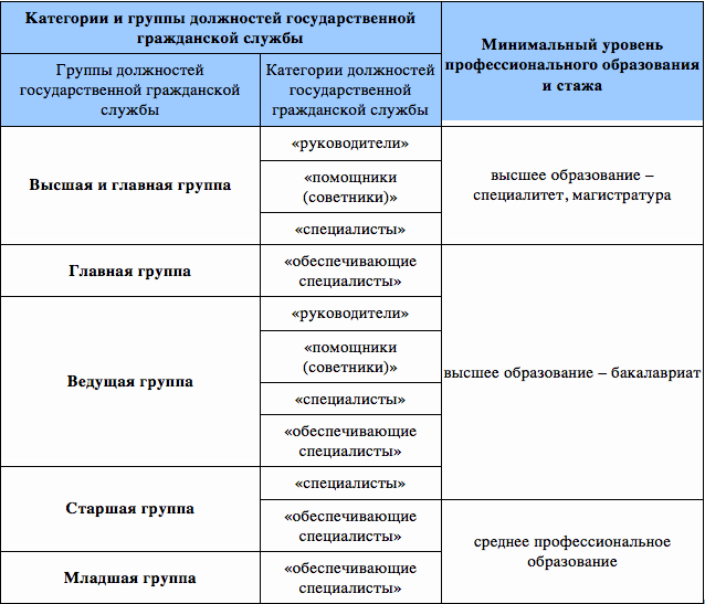 Каждая из групп должностей имеет свою классификацию по категориям. Федеральный закон № 79-ФЗ соотносит группы должностей с их категориями следующим образом: