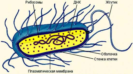 Бактерии представляют собой обычную клетку. То, что у них нет ядра, никак не отражается на функциях. Информация, записанная на ДНК, в виде клубочка хранится в цитоплазме. Также имеется клеточная оболочка, на поверхности которой могут быть микроворсинки, капсулы, жгутики. Бактерии содержат и РНК.