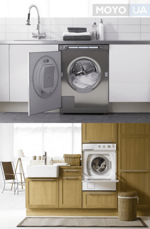 Последняя категория встраиваемых машин может оснащаться функцией сушки белья. Это даёт возможность семье, живущей в стеснённых условиях, высвободить дополнительные квадратные метры, которые раньше использовались в целях размещения приспособлений для развешивания вещей.
