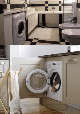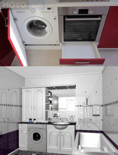 Отдельно стоящие стиральные машинки тоже можно встроить в модуль кухонного гарнитура или установить в ванной комнате. Минимальный ассортимент встраиваемых моделей вынуждает искать другие решения. Например:
