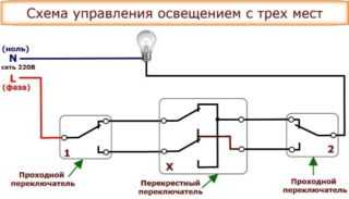 Для двух переключателей на один источник света не требуется составлять сложную схему монтажа. Главная особенность – наличие трехжильного кабеля. Чтобы установить промежуточные элементы и большее количество устройств требуется помощь