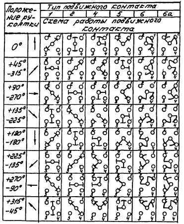 2.1.2. Схема замыканий контактов различных типов при различном положении рукояток согласно ТУ 16-526.127-80.