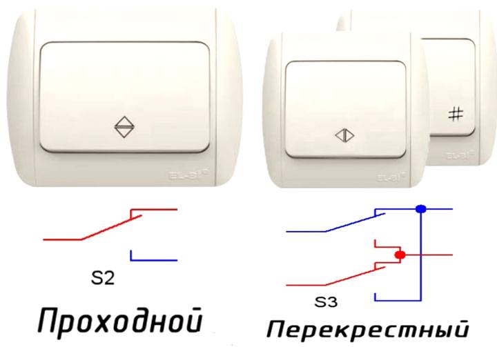 Дополнительный элемент управления необходим для переключения с нескольких точек – трех и больше. В этом состоит отличие выключателя проходного от перекрестного – в данном случае используют последние.