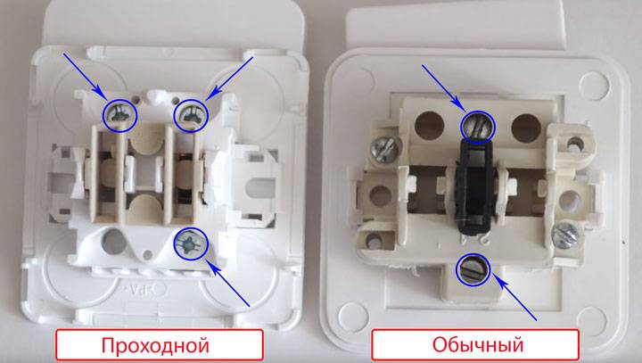 Основное отличие обычных от проходных заключается в количестве контактов. Простые одноклавишные имеют две клеммы для подключения проводов (вход и выход), а проходные — три!