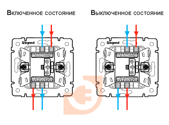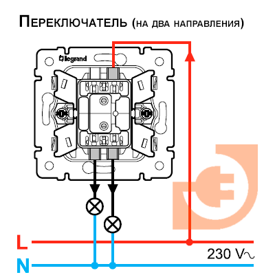 В своих каталогах Legrand применяет понятие «переключатель на два направления» — так оно и есть, потому что переключатель переключает между двумя контактами. Вообще переключатель может переключать между тремя и более контактами, но в электроустановочных механизмах если и встречается такие, то крайне редко, поэтому никто не уточняет на сколько направлений переключают переключатели. Еще часто переключатели называют «проходными выключателями», но это понятие, по нашему мнению, некорректное и его применять не стоит.