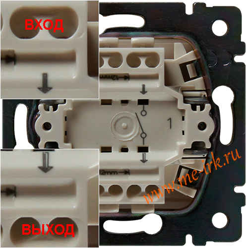 - У правильно смонтированных выключателей, во включенном состоянии клавиша занимает положение «вверх», а в выключенном положение «вниз». При подключении по схеме , если фазный проводник подключить к «выходу» выключателя, а «нагрузку» к входу, то клавиша выключателя будет всегда «перевернута». То есть во включенном состоянии клавиша будет занимать положение «вниз», а должна занимать положение «вверх», и наоборот.