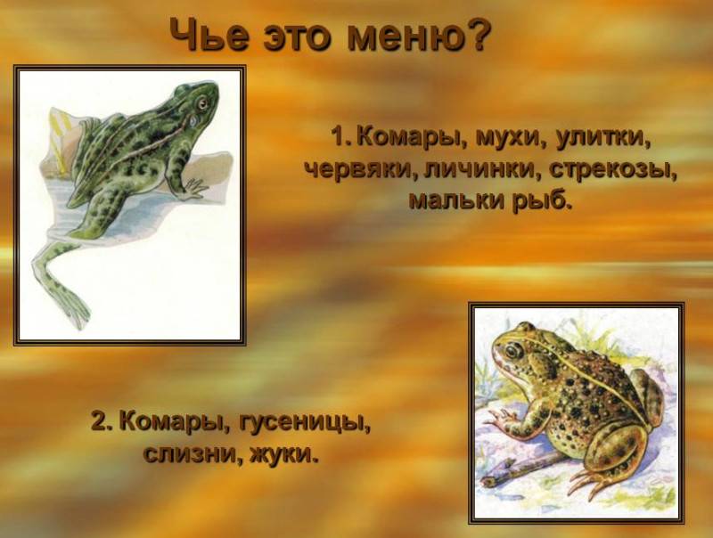 — Лягушки поедают в основном летающих насекомых: комаров, мошек, мух, стрекоз. Охотиться им помогает длинный липкий язык и способность совершать прыжки. Жабы лакомятся слизнями, дождевыми червями, гусеницами, жуками, поэтому у них нет необходимости в активном передвижении и длинные развитые задние лапы им не нужны.
