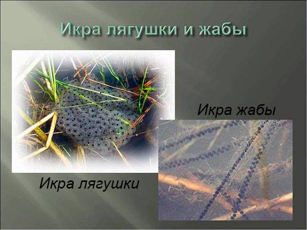 Лягушачья икра по внешнему виду напоминает небольшие слизистые комочки, которые плавают на поверхности водоема. Появившиеся головастики также обитают в воде, и только после взросления, молодая лягушка сможет выходить на сушу. Лягушки откладывают, как правило, значительное количество яиц. Например, бычья лягушка в течение одного сезона может отложить порядка двадцати тысяч икринок.