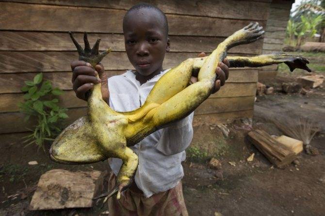 ГолиафГолиаф считается самой большой лягушкой. Длина тела взрослой особи от головы до пят на задних лапах достигает 90 см, а вес — 6 кг. Самый маленький представитель коллектива — какао. Его длина не превышает 3 см. Ниже приведены размеры некоторых видов лягушек.