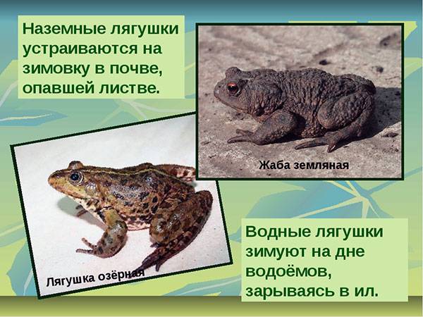 Разные виды лягушек и жаб зимуют в очень разных природных условиях, обусловленных биологическими особенностями: