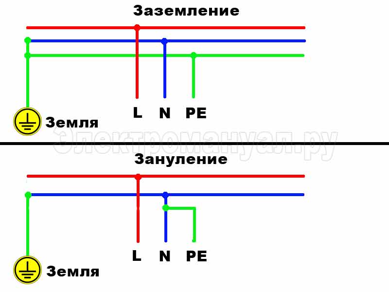 Разница состоит в том, что зануление способствует мгновенному отключению электричества при касании человеком электро шнура или прибора, отводя ток однофазного короткого замыкания на вводной щит, а заземление мгновенно отводит опасное напряжение в почву.
