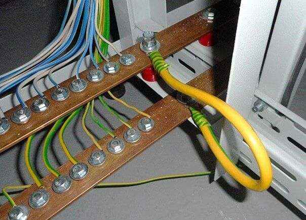 - Корпуса всех потребителей (трехфазных электродвигателей) через медный провод соединяются с описанной шиной.