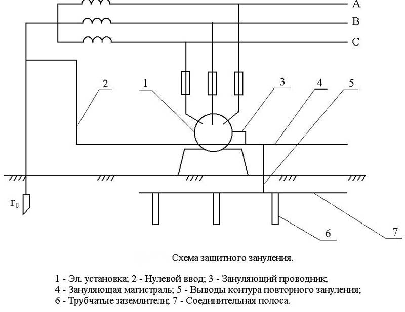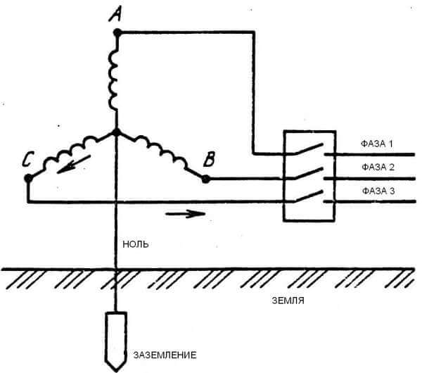 Трехфазная система требует наличие заземления и зануления средней точки рабочих обмоток, соединенных по схеме звезда. Чтобы четко понимать разницу между занулением и заземлением, давайте обратимся к стандартной схеме включения нагрузки к трехфазному источнику питания по схеме Y (звезда). Если мы рассматриваем в качестве нагрузки трехфазный трансформатор, трехфазный асинхронный электродвигатель, трехфазную печь, то система будет функционировать, будучи подключенной с помощью трех проводов с фазами A, B, С и нулевого провода N. По сути, если мы рассматриваем электроустановки на производстве, то наличие четвертого проводника выполняет чисто защитные функции. При пробое изоляции обмоток трехфазного электродвигателя высокий потенциал устремляется на корпус устройства, который находится в прямой гальванической связи с проводом N, то есть рабочим нолем. Следовательно, при таком подключении произойдет короткое замыкание, что вызовет отключение трехфазного автомата защиты.