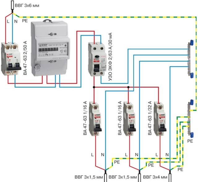 Схема бытовой проводки с РЕ-проводником заземления и защитой ВА и УЗО