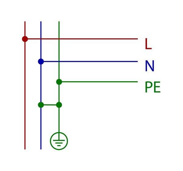 На иллюстрации заземляющий проводник (PE) соединен с землей и рабочим нулем (N).