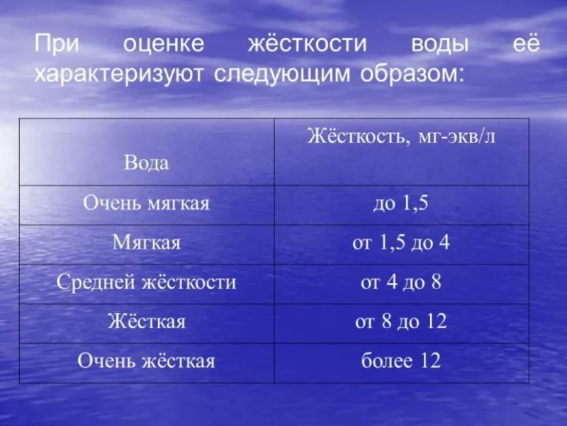 В России такой единицей является градус жесткости, который обозначается °Ж и равен 1 мг-экв/л. В 1°Ж содержится 20,04 мг ионов кальция и 12,16 мг ионов магния. Чем выше градус, тем более жесткой считается вода. Ниже приведены значения для каждого вида.