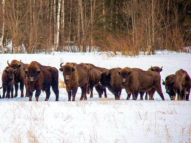 , телята-подростки и малыши — всего около 10 голов. Самцы же зубра гуляют сами по себе.