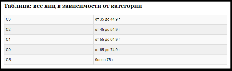 Что же касается цифры в маркировке, то она индексирует категорию яиц, под которой прежде всего подразумевается вес и размер. Для наглядности, стоит привести вспомогательную табличку, которая поможет определить вес яйца в зависимости от его категории.