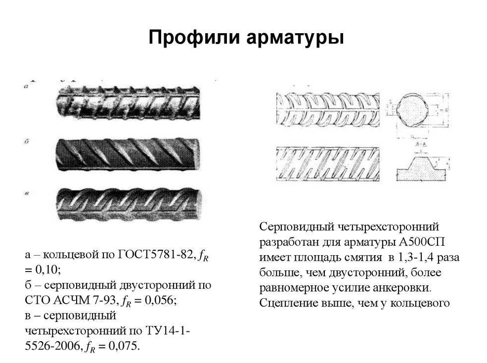Они обе имеют периодический профиль с продольными и поперечными рёбрами, который обеспечивает прочное сцепление металла со смесью бетона. Поперечные рёбра располагаются под углом и разделены на 2 части, которые сходятся в одной точки. Такая форма надёжно фиксирует металлический прут в строительной смеси. Итоговая конструкция получается прочной и способна выдерживать значительные нагрузки. Диаметр профиля варьируется от 6 до 40 миллиметров. Подробные характеристики для прутов каждого сечения расписаны в ГОСТ 5781-82. В документации есть все данные, необходимые для расчёта прочности конструкции и подготовки инженерно-строительной документации.