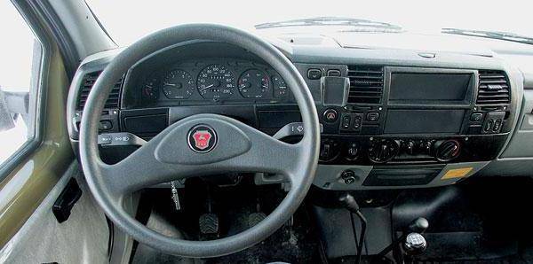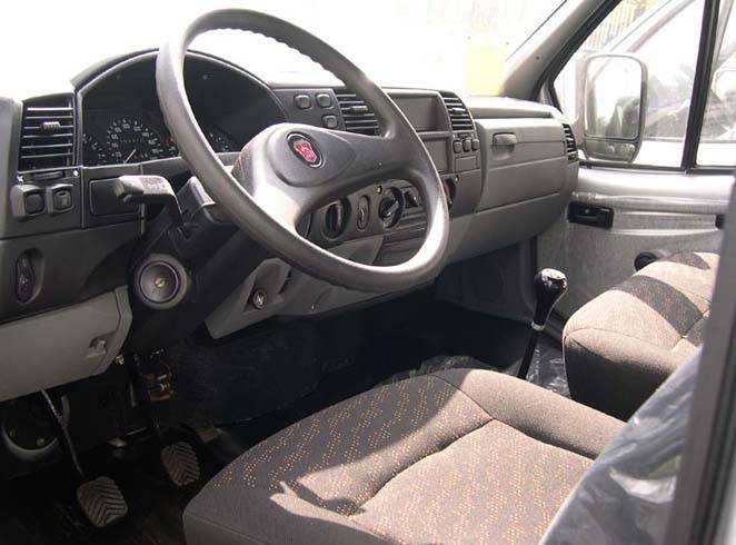 Салон автомобиля комфортный, но простой. В распоряжении водителя — четырёхспицевый руль, рычаг коробки передач, приборная панель с системными индикаторами. Используются материалы среднего качества для отделки салона, они служат многие годы. Сиденья обиваются тканью. Подушки безопасности не предусмотрены, в базовую комплектацию входит система ABS. Есть два варианта исполнения – с низкой и высокой крышей. На оснащение кабины это никак не влияет.