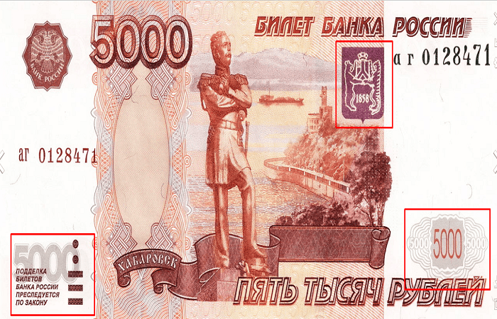 — проверьте, меняет ли свой цвет краска. На лицевой стороне банкноты в 5 000 рублей имеется герб г. Хабаровска, который при изменении угла обзора меняет свой цвет от малинового до золотисто-зеленого. Если посмотреть па банкноту под острым углом на уровне глаз, можно увидеть темные буквы «РР» на орнаментальной ленте, при смене угла наклона буквы становятся светлее. Также при наклоне на однотонном пространстве банкноты появляются радужные полосы. Если увеличить изображение дальнего берега, то просматриваются образы дальневосточной флоры и фауны.