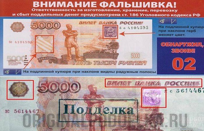 Центробанк РФ выпустил множество брошюр, посвященных опознаванию фальшивок среди российских банкнот. Инструкция по распознаванию фальшивых пятитысячных банкнот оказалась самой детальной и объемной.