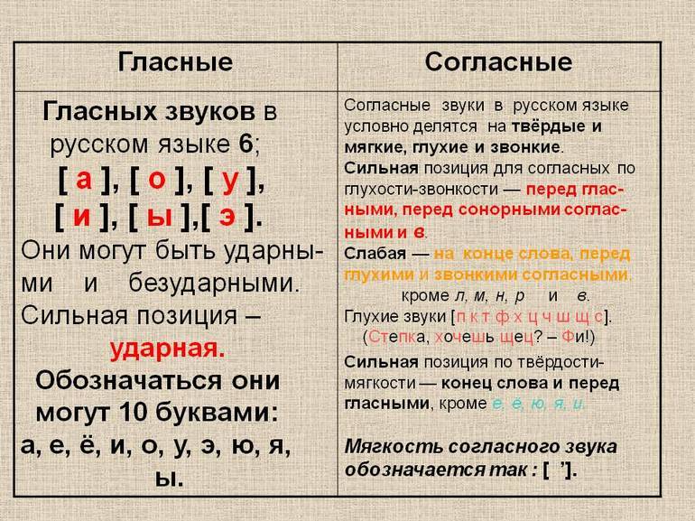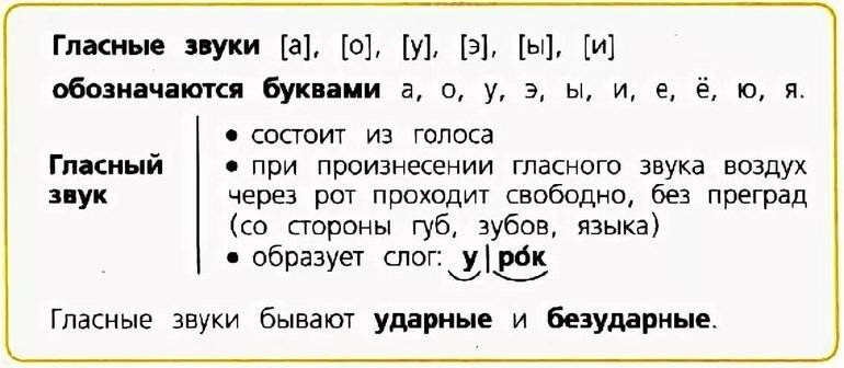 Гласные звуки нужны для образования слогов. Они произносятся с помощью голоса и определённого положения языка и губ. Выделяют передние, средние и задние гласные по положению языка. По участию в произношении губ выделяют губные (О, У) и неогубленные (Ы, И, Э). Буквы Я, Ё, Ю, Е состоят из двух звуков – согласного и гласного (ЙА, ЙО, ЙУ, ЙЭ).