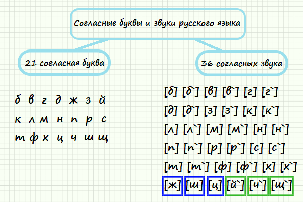 Согласных звуков, четко различающихся в русском языке (например, перед гласными), – 36: , , , , , , , , , , , , , , , , , , , , , , , , , , , , , , , , , , , (в речи людей старшего поколения в отдельных словах, таких, как дрожжи, вожжи, брызжет и др., может произноситься долгий мягкий согласный ). Согласных звуков в русском языке больше, чем согласных букв (36 и 21 соответственно). Причина этого состоит в одной из особенностей русской графики – в том, что мягкость парных согласных звуков в русском языке обозначается не согласной буквой, а гласной буквой (е, ё, ю, я, и) или ь (мал – мял , кон – конь ).