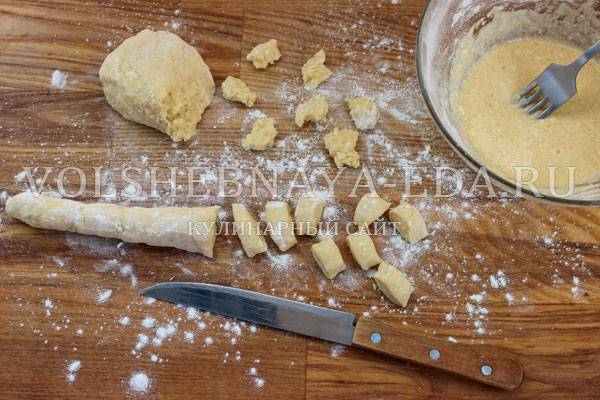 - Катаные — готовятся из плотного теста, которое раскатывается колбаской, режется на кусочки, а из них катаются шарики. Такой тип замеса в основном используется, когда нужно приготовить галушки или клецки с начинкой. Чтобы изделия лучше держали форму, шарики желательно подсушить около часа перед варкой. Причем задавать им можно любую форму, которую вам подскажет фантазия.