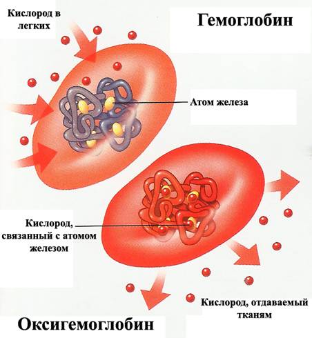 Большую часть цитоплазмы эритроцита занимает гемоглобин, состоящий из белка и гемового железа, которое придает крови красный цвет. Небелковая часть представляет собой четыре молекулы гема с атомом Fe в каждой. Именно благодаря гемоглобину эритроцит способен переносить кислород и выводить углекислый газ. В легких атом железа связывается с молекулой кислорода, гемоглобин превращается в оксигемоглобин, придающий крови алый цвет. В тканях гемоглобин отдает кислород и присоединяет углекислый газ, превращаясь в карбогемоглобин, в результате кровь становится темной. В легких углекислый газ отделяется от гемоглобина и выводится легкими наружу, а поступивший кислород вновь связывается с железом.