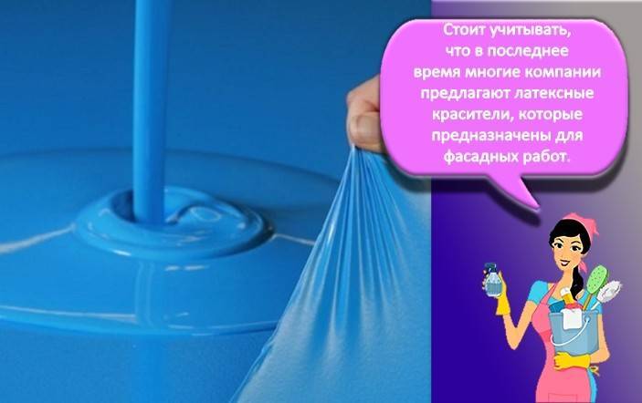 Стоит учитывать, что в последнее время многие компании предлагают латексные красители, которые предназначены для фасадных работ. Они содержат минимум главного связующего компонента, бутадиен-стирола.