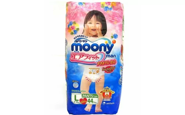 Японский бренд Moony предлагает подгузники специально для девочек. Выбрать нужный вариант не сложно даже без познаний в японском языке. Нужная пачка окрашена в розовый цвет, на ней нарисована девочка. Рисунки на самом памперсе также выполнены в розовых тонах.