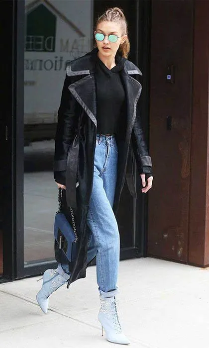В этом сезоне Джиджи Хадид остановилась на широких бойфрендах с низкой линией подола и украшенным пеплумом. Вы можете последовать ее примеру и носить такие брюки с красными остроносыми сапогами, ярко-красным топом и джинсовой курткой в тон.